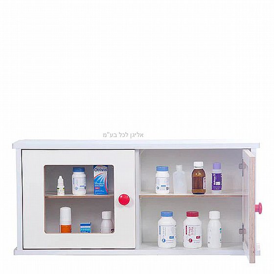 خزانة أدوية تعليمية للأطفال، مصممة لمحاكاة خزانة الإسعافات والأدوية بشكل آمن وتعليمي.