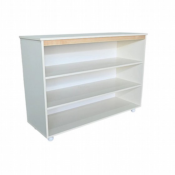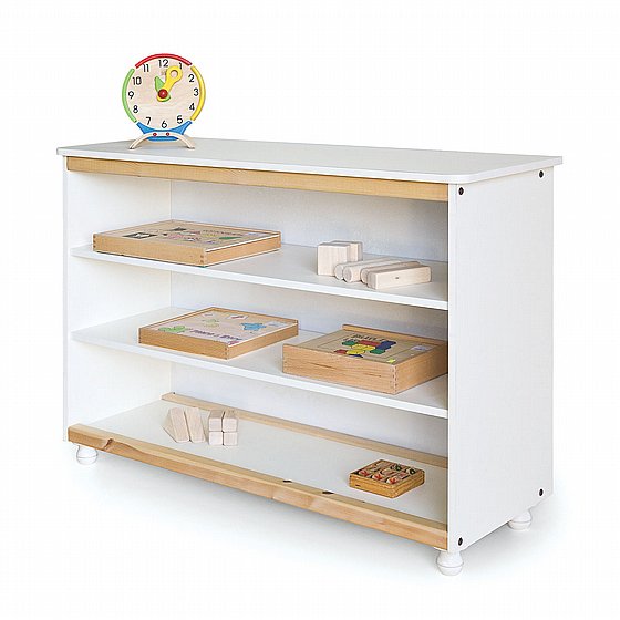 خزانة عرض وتنظيم تعليمية للأطفال مع أرفف مفتوحة، مصممة لعرض الألعاب التعليمية، البازل، المكعبات والمواد التعليمية بطريقة مرتبة وسهلة الوصول.