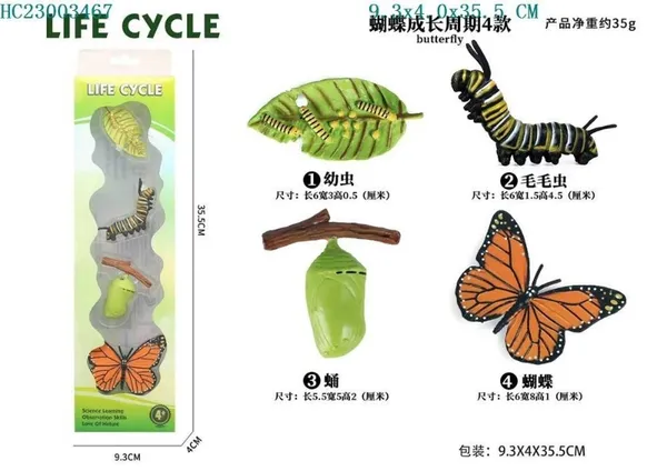 مجموعة تعليمية توضح المراحل الأربع لتحوّل الفراشة، باستخدام مجسّمات ثلاثية الأبعاد تساعد الطفل على فهم التحوّل الكامل بطريقة ممتعة وبصرية.