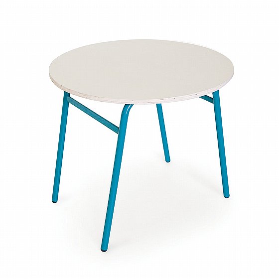 طاولة دائرية تعليمية للأطفال بهيكل معدني وسطح خشبي، مصممة للأنشطة الجماعية، اللعب والرسم بطريقة مريحة وآمنة.