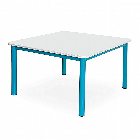 طاولة تعليمية مربعة للأطفال بهيكل معدني وسطح أملس، مصممة للأنشطة الجماعية، الرسم والتعلّم في البيئات التعليمية.