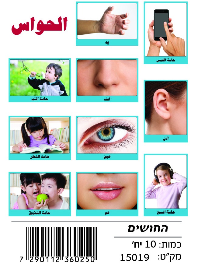 • التصميم: صور توضيحية مع أسماء الحواس وأعضائها